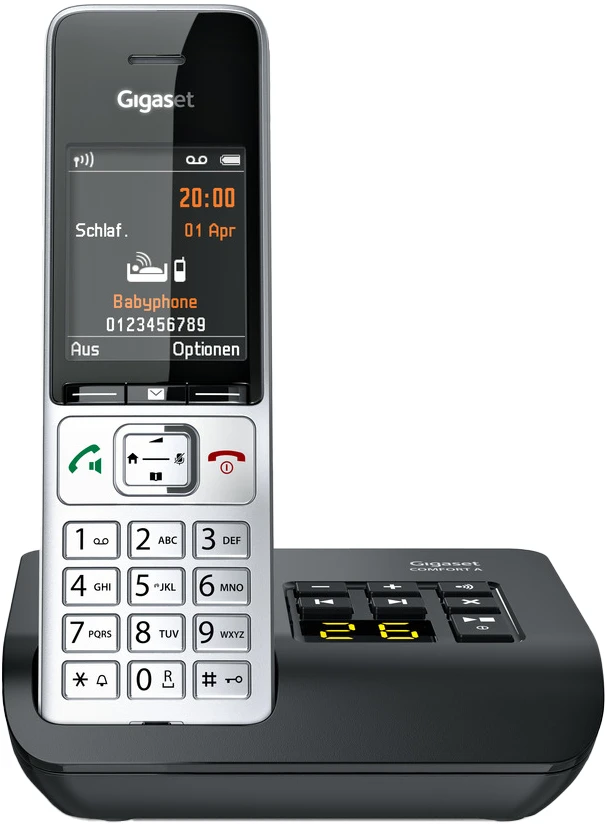 Sie sind oft unterwegs und wollen keinen Anruf verpassen? Dann ist das Großtastentelefon Gigaset E560A mit Anrufbeantworter perfekt. Mit den großen Tasten an der Basisstation können Sie den Anrufbeantworter bequem bedienen. Die Basisstation bietet Ihnen exzellente Akustik im Freisprechmodus und ist gleichzeitig ein eigenständiges Telefon mit Direktwahltasten und Notruffunktion. Auch gut: Für Ihren individuellen Ansagetext haben Sie bis zu 170 Sekunden Zeit. Zudem stehen Ihnen 25 Minuten Aufnahmezeit für viele Nachrichten zur Verfügung.
